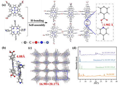 圖1 Ni-TCPP-TPyP的合成路線(xiàn)及其晶體結(jié)構(gòu)表征