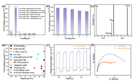 圖2(a-d)材料的光催化CO2還原性能和(e-f)材料的光電化學(xué)性質(zhì)。