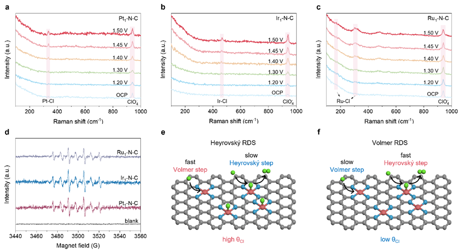 M1–N–C上發(fā)生的反應(yīng)遵循以Cl物種為中間體的Volmer-Heyrovsky步驟。此外通過(guò)測(cè)量M1–N–C在不同Cl?濃度下的CER活性,推斷Heyrovsky為決速步(圖4)。