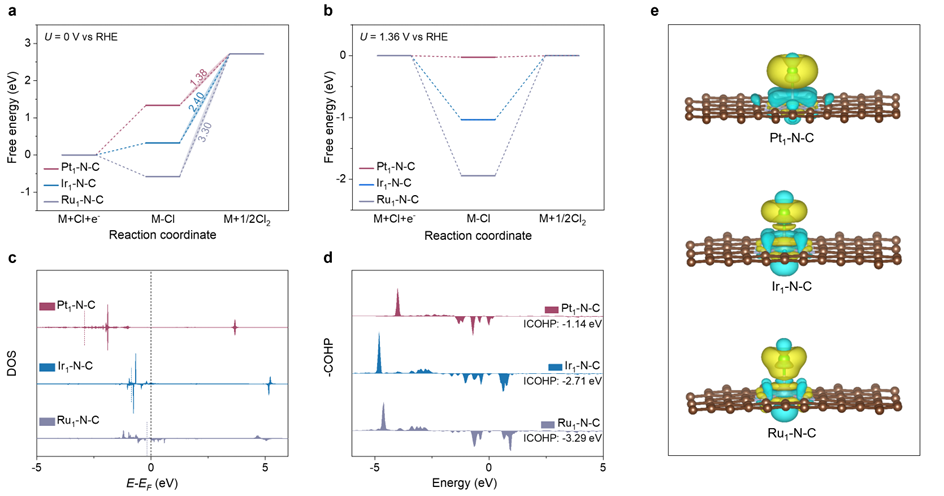 在U=0時(shí),Heyrovsky步驟(ΔGCl*-Cl)的吉布斯自由能變化比Volmer步驟(ΔGCl*)高,這表明Heyrovsky步驟是三個(gè)M-N4位點(diǎn)上的決速步(圖5a)。此外,Pt–N4上的ΔGCl*-Cl遠(yuǎn)低于Ir-N4和Ru-N4上的ΔGCl*-Cl,這表明CER活性的順序?yàn)?/span>Pt–N4 > Ir–N4 > Ru–N4。同時(shí),Pt–N4、Ir–N4和Ru–N4在1.36 V vs RHE時(shí)的ΔGCl*-Cl分別為0.02、1.04和1.94 eV。值得注意的是,Pt–N4位點(diǎn)的ΔGCl*-Cl(0.02 eV)最接近于零,Pt–N4是理想催化活性位點(diǎn)。此外,DOS和COHP表明,Pt–N4的d帶中心最負(fù),導(dǎo)致其占據(jù)最高的反鍵態(tài),且Pt–N4對(duì)Cl物種的吸附最弱,從而獲得最小的結(jié)合能和吉布斯自由能壘。同時(shí),Bader電荷的定量計(jì)算表明,與Ir–N4和Ru–N4相比,Pt–N4的電子轉(zhuǎn)移量最大,這表明Pt–N4的反應(yīng)速度最快。綜上所述,這些DFT計(jì)算共同驗(yàn)證了Pt–N4 > Ir–N4 > Ru–N4的固有CER活性趨勢(shì),與實(shí)驗(yàn)結(jié)果相符。