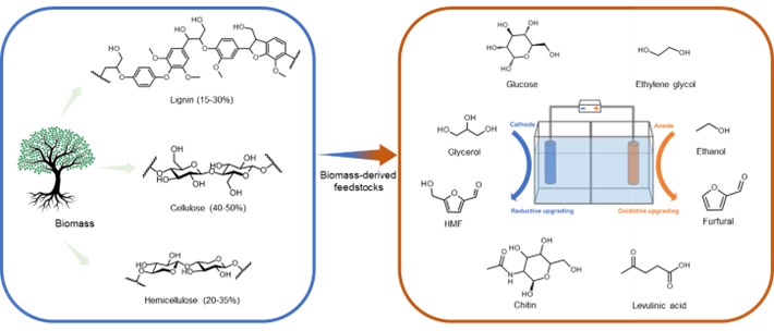 此外,生物質(zhì)衍生物因其快速再生且可降解的特性,已成為生物燃料和化學(xué)工業(yè)的寶貴替代原料。相較于傳統(tǒng)生物質(zhì)轉(zhuǎn)化中涉及的熱催化轉(zhuǎn)化,電化學(xué)精煉過程為生物質(zhì)資源的利用提供了一種更為環(huán)保、更低能耗的替代方案。該過程能夠?qū)⒇S富但未得到充分利用的生物質(zhì)資源轉(zhuǎn)化為高價值的商業(yè)化產(chǎn)品。