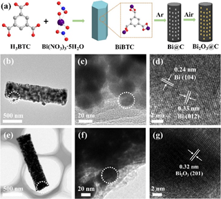 基于此,華中科技大學(xué)夏寶玉教授課題組在強(qiáng)化Bi基催化劑中的Bi-O鍵晶體結(jié)構(gòu)研究基礎(chǔ)上(ACS Catalysis 2020, 10, 743-750),設(shè)計(jì)制備一種新型的碳納米棒封裝氧化鉍催化劑。該催化劑可以有效地將CO2電催化還原為甲酸 (Angew. Chem.Int.Ed.2020.DOI:10.1002/anie.202000657)。實(shí)驗(yàn)結(jié)果表明,Bi2O3@C中的協(xié)同作用促進(jìn)了CO2的快速選擇性還原,其中Bi2O3有助于改善反應(yīng)動(dòng)力學(xué)和甲酸選擇性,而碳基質(zhì)則有助于提高甲酸生產(chǎn)的活性和電流密度。在催化CO2還原為甲酸的過(guò)程中,該合成的催化劑的起始電位低至‐0.28 V vs. RHE,部分電流密度超過(guò)200 mA cm‐2,生成甲酸的法拉第效率高達(dá)93%,而且表現(xiàn)出優(yōu)異的穩(wěn)定性。該工作為高效甲酸生產(chǎn)提供了一種基于鉍的MOF基衍生催化劑,并且有助于推動(dòng)電催化CO2轉(zhuǎn)化技術(shù)的進(jìn)一步發(fā)展。