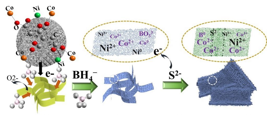 華中科技大學(xué)夏寶玉課題組通過氧化還原策略來調(diào)控雙金屬Co-Ni MOF納米薄片的結(jié)晶性和電子結(jié)構(gòu)來增強材料法拉第電容。依次通過硼化和硫化處理后,得到穩(wěn)定低價的混合價態(tài)的Co-Ni MOF衍生物(Co-Ni-B-S)。該衍生物不僅保存了原始Co-Ni MOF的結(jié)構(gòu)完整性,活化后表現(xiàn)為部分晶態(tài)和非晶態(tài)共存的結(jié)構(gòu),有利于實現(xiàn)優(yōu)異的電化學(xué)性能。測試結(jié)果表明:(1)活化后的Co-Ni-B-S樣品在1 A g-1的電流密度下,可達(dá)到1281 F g-1的高比電容;(2)在20 A g-1的電流密度下,可達(dá)到802.9 F g-1的高比電容,具有出色的倍率性能;(3)經(jīng)過10,000次循環(huán)后容量保留率可達(dá)到92.1%,表現(xiàn)出優(yōu)良的循環(huán)性能穩(wěn)定性。基于Co-Ni-B-S電極制造的儲能裝置在功率密度為857.7 W kg-1時表現(xiàn)出50.0 Wh kg-1的高能量密度,在12 A g-1下經(jīng)過5000次循環(huán),容量保持率可達(dá)到87.7%。同時,在以活性炭為負(fù)極組裝的超級電容器器件的測試中,發(fā)現(xiàn)器件在水系電解液中可以得到1.7 V的高電壓,給此材料的應(yīng)用提供了更多的可能性。