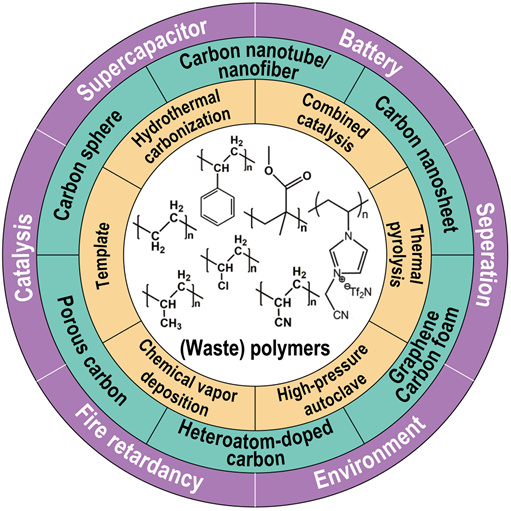 碳材料的形貌、孔結(jié)構(gòu)和化學(xué)組成對碳材料性能起到了決定性的作用(Science 2011, 332, 1537)。作者進一步分析了如何調(diào)控聚合物碳化產(chǎn)物的物理化學(xué)性質(zhì),包括形貌、孔結(jié)構(gòu)和摻雜元素。此外,碳材料在許多領(lǐng)域有著重要應(yīng)用,比如能源存儲和環(huán)境污染治理(Science 2012, 335, 1326)。作者總結(jié)了聚合物可控碳化產(chǎn)物在超級電容器、鋰離子電池、吸附與分離、存儲氫氣、光催化降解有機物等領(lǐng)域中的應(yīng)用。最后,作者展望了聚合物可控碳化反應(yīng)研究的未來發(fā)展方向和應(yīng)用前景。歸納起來有四點:第一,進一步提高碳材料的產(chǎn)率。廢棄聚合物中往往含有填料、添加劑等雜質(zhì),會影響聚合物的降解以及碳材料的生長。因此,開發(fā)新型催化劑或者新的聚合物碳化方法是一個重要的發(fā)展方向。第二,進一步改善材料的微觀結(jié)構(gòu)、提升材料的性能。這就要求制備合適比表面積、孔徑分布、摻雜原子和表面官能團的碳材料。第三,進一步降低聚合物碳化溫度,提高碳保護層的強度,從而提高聚合物阻燃性能。第四,進一步探索(廢棄)聚合物基碳材料的大規(guī)應(yīng)用,比如廢水處理、土壤修復(fù)和海水淡化。