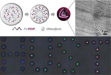 4月2日,《先進(jìn)材料》在線刊發(fā)了題為“Responsive Block Copolymer Photonic Microspheres” (Adv. Mater. 2018, DOI: 10.1002/adma.201707344)的研究成果。我校為第一完成單位,論文第一作者是化學(xué)與化工學(xué)院博士生楊一,朱錦濤教授為論文通訊作者。光子晶體是具有周期性有序結(jié)構(gòu)的光學(xué)材料,由于結(jié)構(gòu)多樣性和可設(shè)計性使其在顯示、編碼載體、傳感和光纖等方面有重要應(yīng)用。該團(tuán)隊針對目前人工光子晶體制備方法復(fù)雜,形式單一、光學(xué)信號的角度依賴等問題,設(shè)計了一種基于嵌段共聚物的響應(yīng)性光子晶體微球。通過微流控技術(shù)與嵌段聚合物空間受限組裝相結(jié)合的方法,構(gòu)建了具有類似洋蔥狀的同心層有序結(jié)構(gòu);獨特的三維對稱結(jié)構(gòu)使其在溶液pH值和有機(jī)溶劑響應(yīng)時具有良好的單色性和光學(xué)信號角度獨立性,可用于溶液性質(zhì)的裸眼檢測和傳感等領(lǐng)域。該研究不僅提出了一種新的有序結(jié)構(gòu)光學(xué)材料構(gòu)筑方法,還為設(shè)計周期性結(jié)構(gòu)提供了一種新的模板。