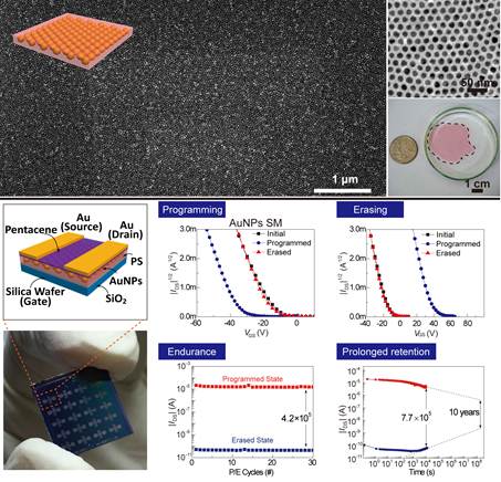 5月21日,《先進(jìn)材料》在線刊發(fā)了團(tuán)隊最新研究成果“Centimeter-scale Inorganic Nanoparticles Superlattice Monolayer with Non-closed-packing and Its High Performance in Memory Devices)” (Adv. Mater. 2018, DOI: 10.1002/adma.201800595)。我校為第一完成單位,化學(xué)與化工學(xué)院博士后王珂及南京郵電大學(xué)博士生凌海峰為共同第一作者,朱錦濤教授與南京郵電大學(xué)解令海教授、儀明東教授為論文的共同通訊作者。超晶格是一種具有嚴(yán)格周期性和高度有序性的納米復(fù)合材料。團(tuán)隊成員利用高分子接枝金納米粒子(組裝基元)具有的微弱兩親性,提出了一種新的“油/水界面快速組裝”法。隨有機(jī)溶劑的揮發(fā),納米粒子在油/水兩相界面快速(小于1秒)自組裝成大面積的超晶格單層膜(約3×3厘米)。該方法克服了本領(lǐng)域難以構(gòu)建大面積、非緊密堆積超晶格單層膜的難題,實現(xiàn)了超晶格從緊密堆積到非緊密堆積的轉(zhuǎn)變和超晶格材料晶格常數(shù)的大范圍調(diào)控,為非緊密堆積超晶格材料在微電子、生物傳感、光電器件等領(lǐng)域的應(yīng)用提供了可能。基于此,團(tuán)隊成員與南京郵電大學(xué)解令海團(tuán)隊合作,以制備的超晶格單層膜為納米浮柵層,構(gòu)筑了一種高性能有機(jī)場效應(yīng)電信號存儲器。與傳統(tǒng)方法制備的同類型電信號存儲器相比,該存儲器在存儲窗口、維持時間、器件穩(wěn)定性等方面都表現(xiàn)出優(yōu)異性能。例如,與傳統(tǒng)的無序結(jié)構(gòu)超晶格存儲器件相比,該類高度有序超晶格納米浮柵存儲器件的存儲開關(guān)比可達(dá)105,實現(xiàn)了存儲態(tài)分明的8階存儲特性(即3比特信息存儲),并且穩(wěn)定的存儲壽命可達(dá)10年以上。