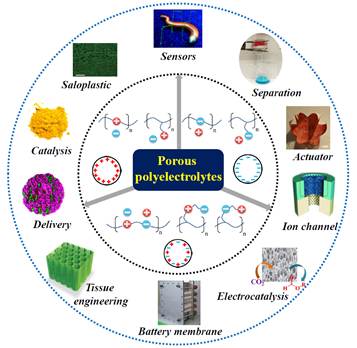 此次應(yīng)邀為《德國應(yīng)用化學(xué)》撰寫的論文以上述工作為主要基礎(chǔ),論述了多孔聚電解質(zhì)領(lǐng)域的最新進(jìn)展,包括材料制備新方法以及在能源轉(zhuǎn)化、水處理、分子分離、化學(xué)催化、傳感響應(yīng)和組織工程等領(lǐng)域的應(yīng)用。分析了多孔聚電解質(zhì)材料化學(xué)的難點(diǎn),展望了未來發(fā)展方向和前景。