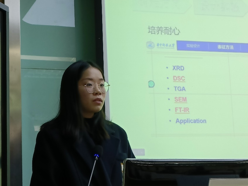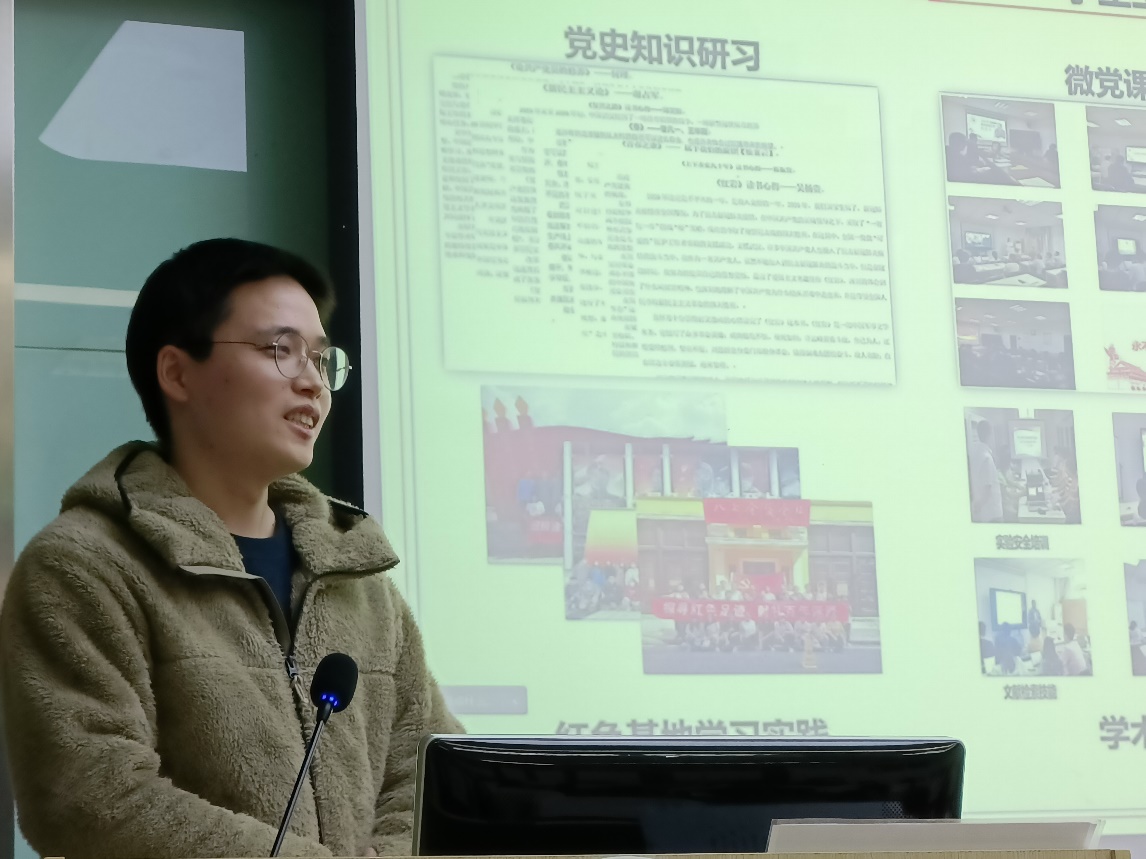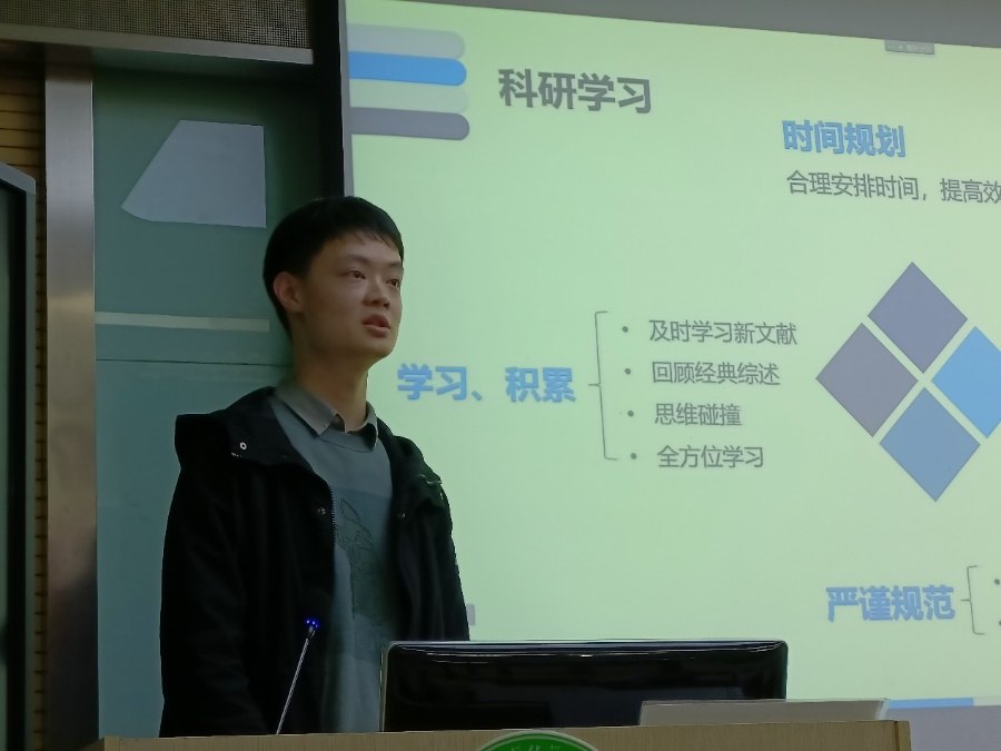 陳振賢以科研.生活6+1為題展開,首先從學生工作以及課外生活做了介紹。研究生生活不應該只有學術,同樣可以玩出強大。在就職黨支部書記時,組織參與了多種形式組織生活,微黨課論講,紅色基地實踐等活動;在暑期時,借助學校喻竹計劃平臺積極進行暑期實踐等等,向我們展示了不一樣的研究生生活。