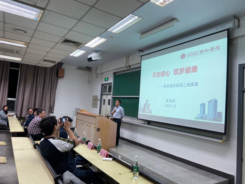 接下來便是武漢協(xié)和醫(yī)院副院長張進祥教授主講主題為“不忘初心,筑夢健康”的思政課。張院長用幽默風(fēng)趣的語言,以自身人生經(jīng)歷為主線,穿插求學(xué)及行醫(yī)過程中的趣事,將職業(yè)生涯生動地展現(xiàn)在同學(xué)面前。他不止一次提到自己對醫(yī)療事業(yè)的熱愛,對“明天會更好”的堅定信念。張院長用自己的故事勉勵同學(xué)們,不經(jīng)歷磨難的人生是不完整的,艱苦是人生的必修課,“學(xué)海無涯苦做舟”,同學(xué)們要用堅定的信念支撐自己,在醫(yī)學(xué)探索的路上一步一個腳印地走下去。他還引用了李元元校長在新生開學(xué)典禮上的講話,期望同學(xué)們懷家國情、立鴻鵠志,做新時代卓越的醫(yī)學(xué)工作者。與同學(xué)們互動交流中,張院長再次表達了他對醫(yī)學(xué)的熱愛與堅守,質(zhì)樸卻包含深情的話語再次給同學(xué)們以鼓勵,給同學(xué)們以信心。