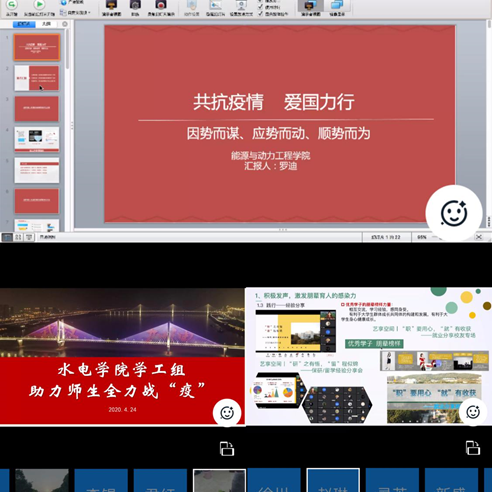 能源學(xué)院羅迪老師從“一段學(xué)生家長的回信”、“一件關(guān)于口罩的‘小事’”、“一個(gè)刷屏的消息”說起,闡述了能源學(xué)院學(xué)工組疫情之下因勢而謀,趁勢而動(dòng),順勢而為的工作思路;水電學(xué)院張建老師從“組織生活不走樣思政引領(lǐng)爭先鋒,”、“停課不停學(xué),師生共努力”、“異地不失聯(lián),關(guān)懷在人心”三方面切入,分享了水電學(xué)院學(xué)工組助力全員抗疫的經(jīng)驗(yàn)做法,同時(shí)闡述了自己在網(wǎng)絡(luò)培訓(xùn)班中對于疫情防控期間用依法治校思維管理學(xué)生工作的思考,引人深思;藝術(shù)學(xué)院趙琳老師通過生動(dòng)的案例講述,分享了藝術(shù)學(xué)院如何在疫情之下發(fā)揮朋輩作用,從而提升思想引領(lǐng)的鮮活力與擴(kuò)大擴(kuò)大主題教育的傳播力。