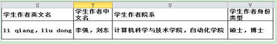請(qǐng)將所有屬于學(xué)生的作者信息全部填入學(xué)生作者信息欄(S-V列),有幾個(gè)學(xué)生作者,就需要填入幾個(gè)學(xué)生作者的信息,之間用“逗號(hào)(,)”隔開(kāi)。如某篇論文中有“李強(qiáng)、劉東”為我校學(xué)生,分別是計(jì)算機(jī)學(xué)院與自動(dòng)化學(xué)院,李強(qiáng)是碩士,劉東是博士,則填寫(xiě)如下: